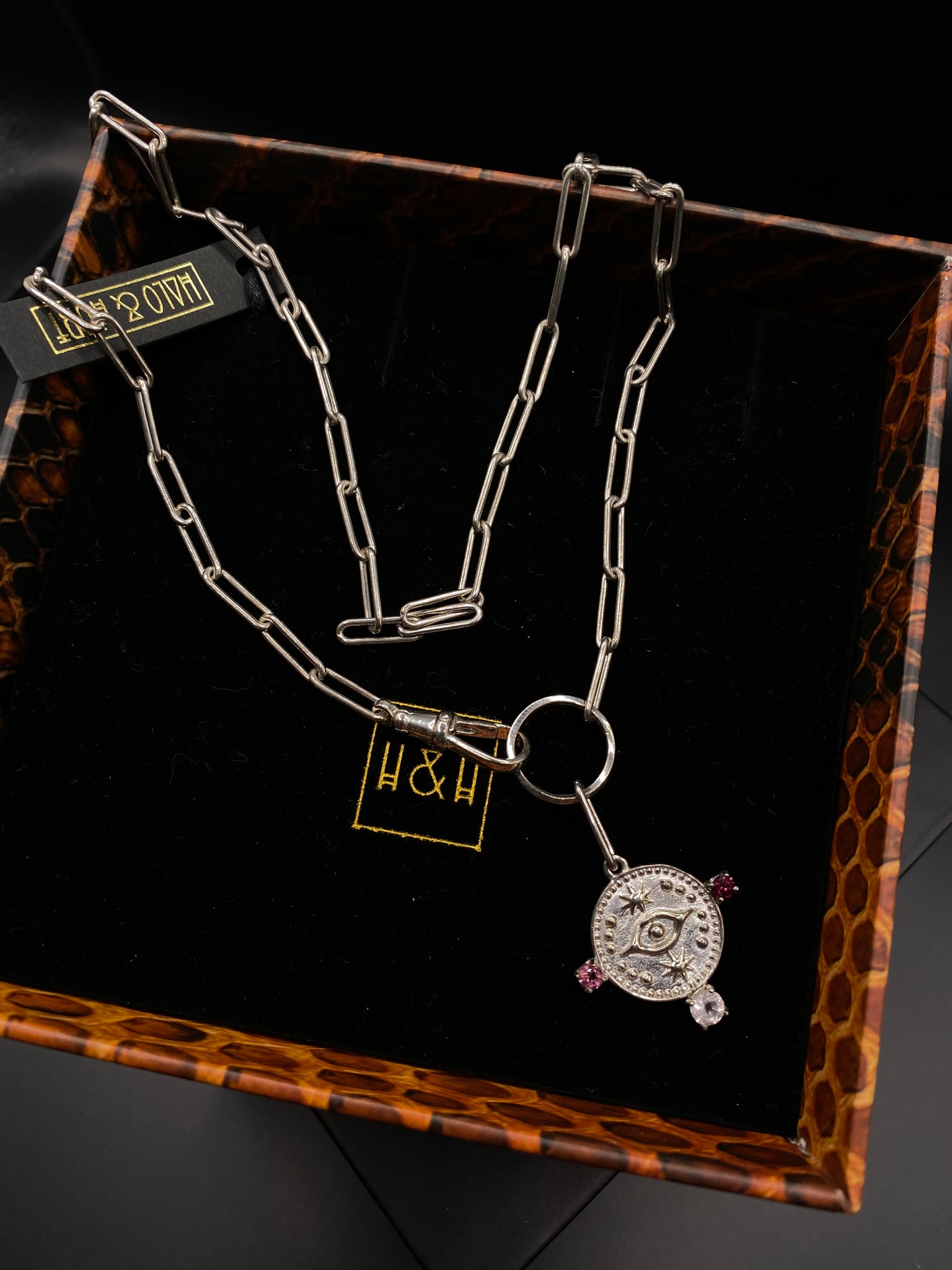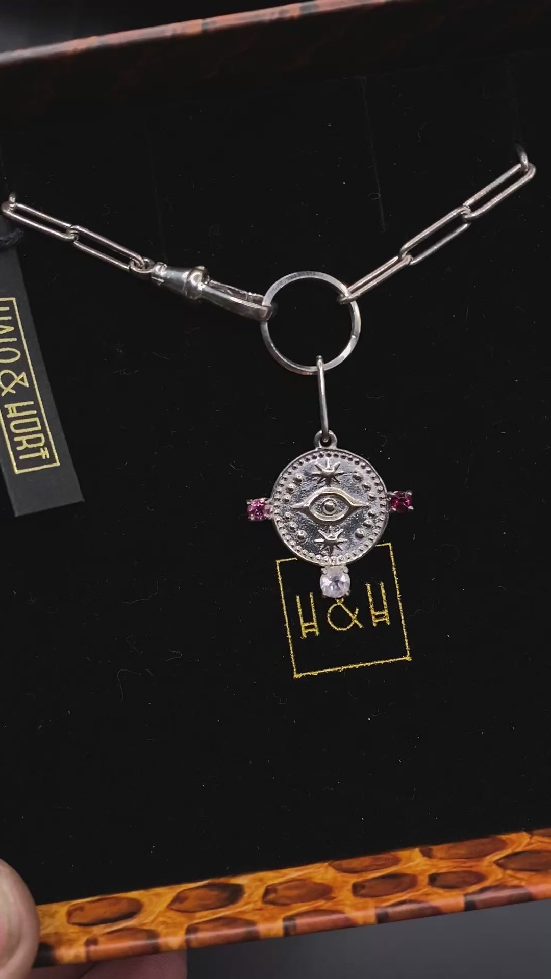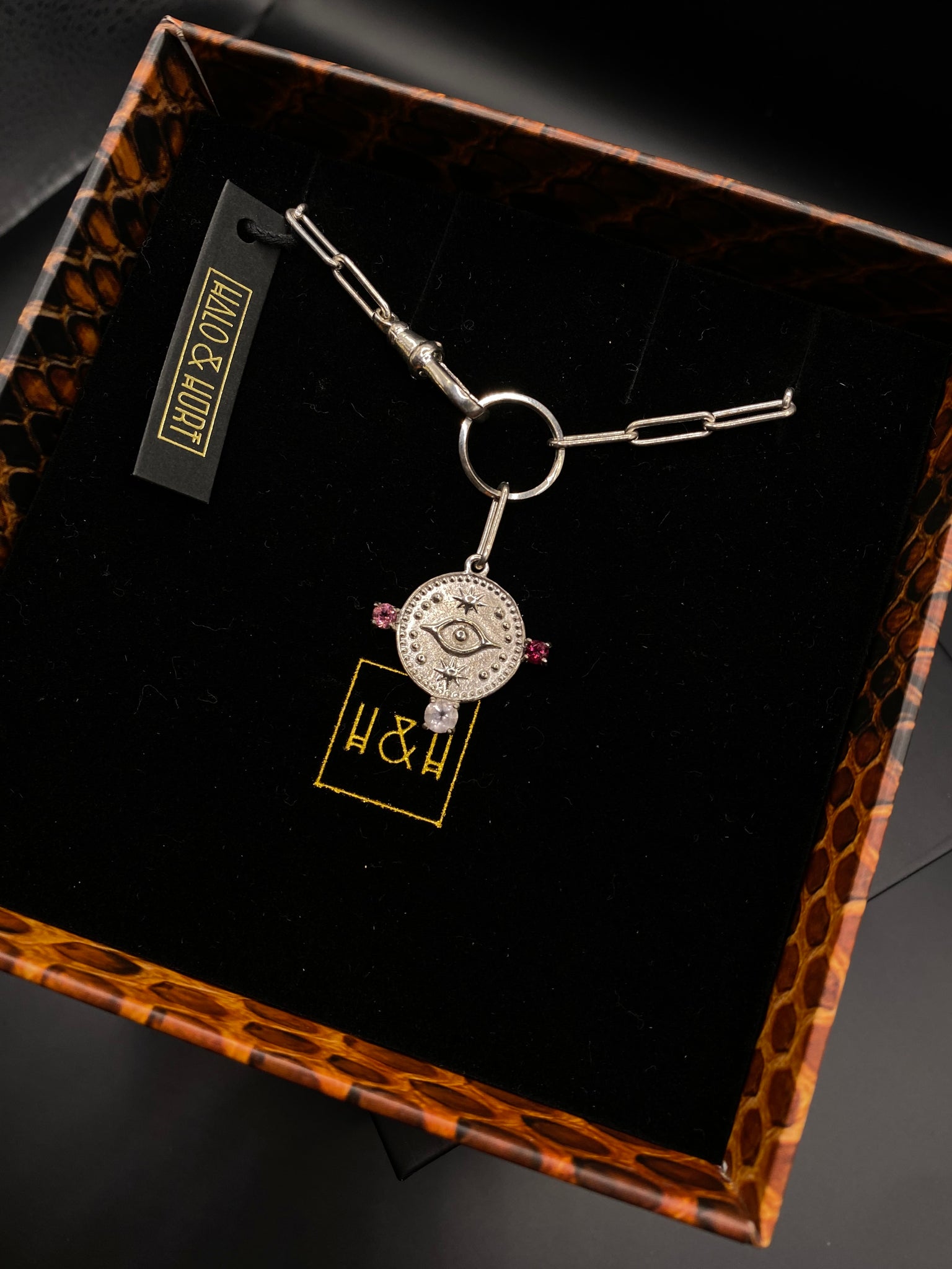 The pendent itself is set with a gradient of pinks. Tourmaline, rose quartz and rhodalite garnet.