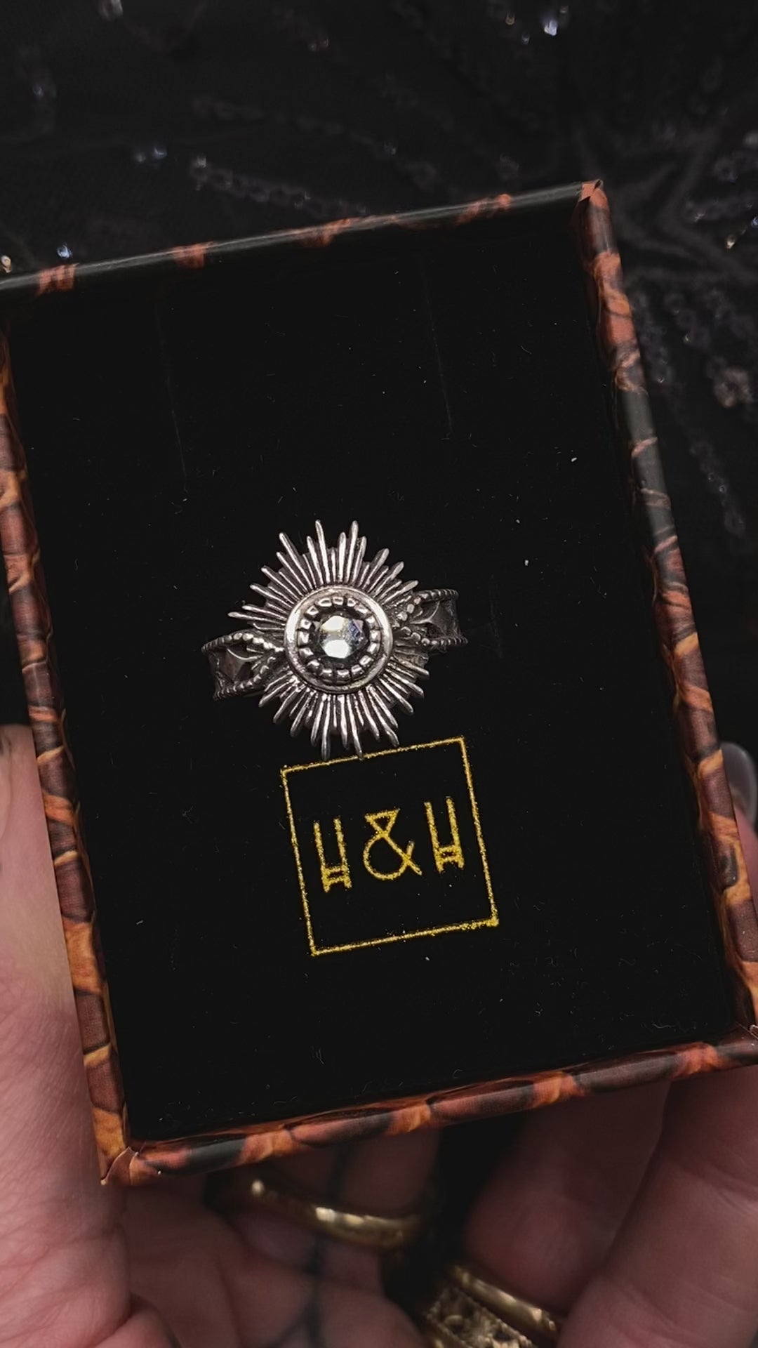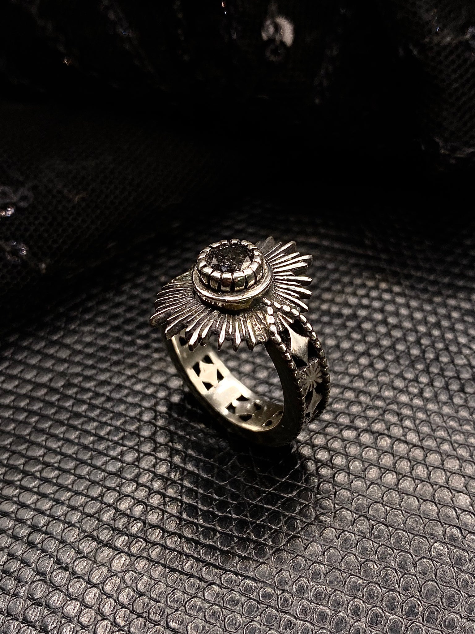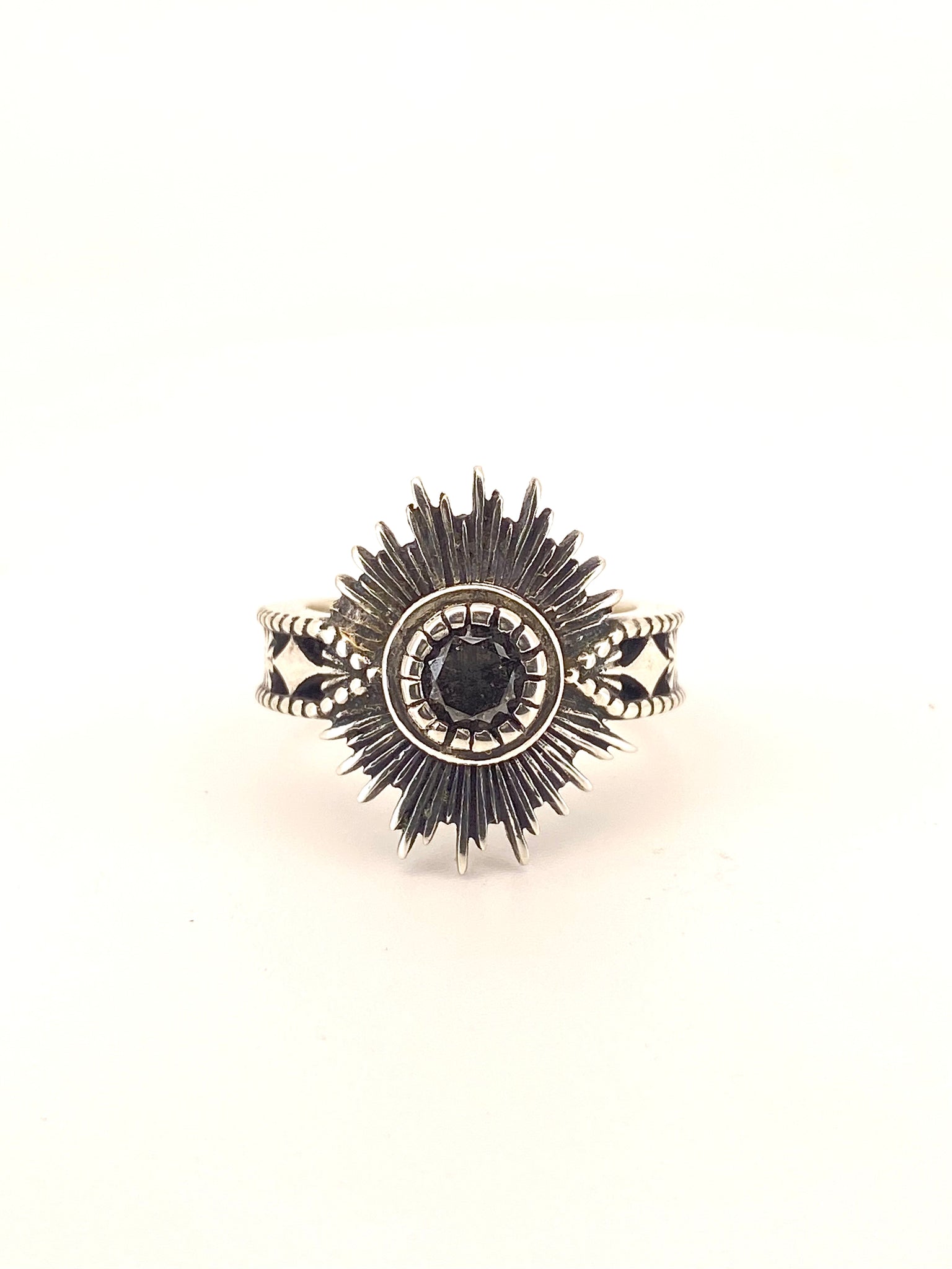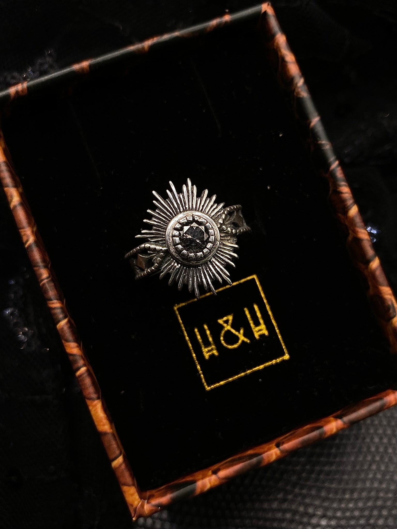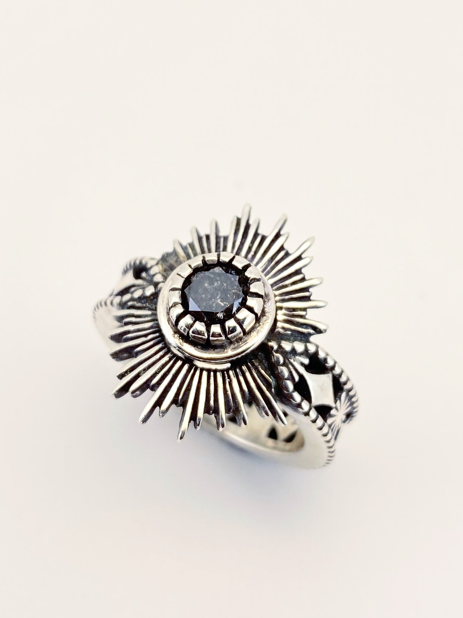 A deep and moody Salt & Pepper diamond bezel set in sterling silver.